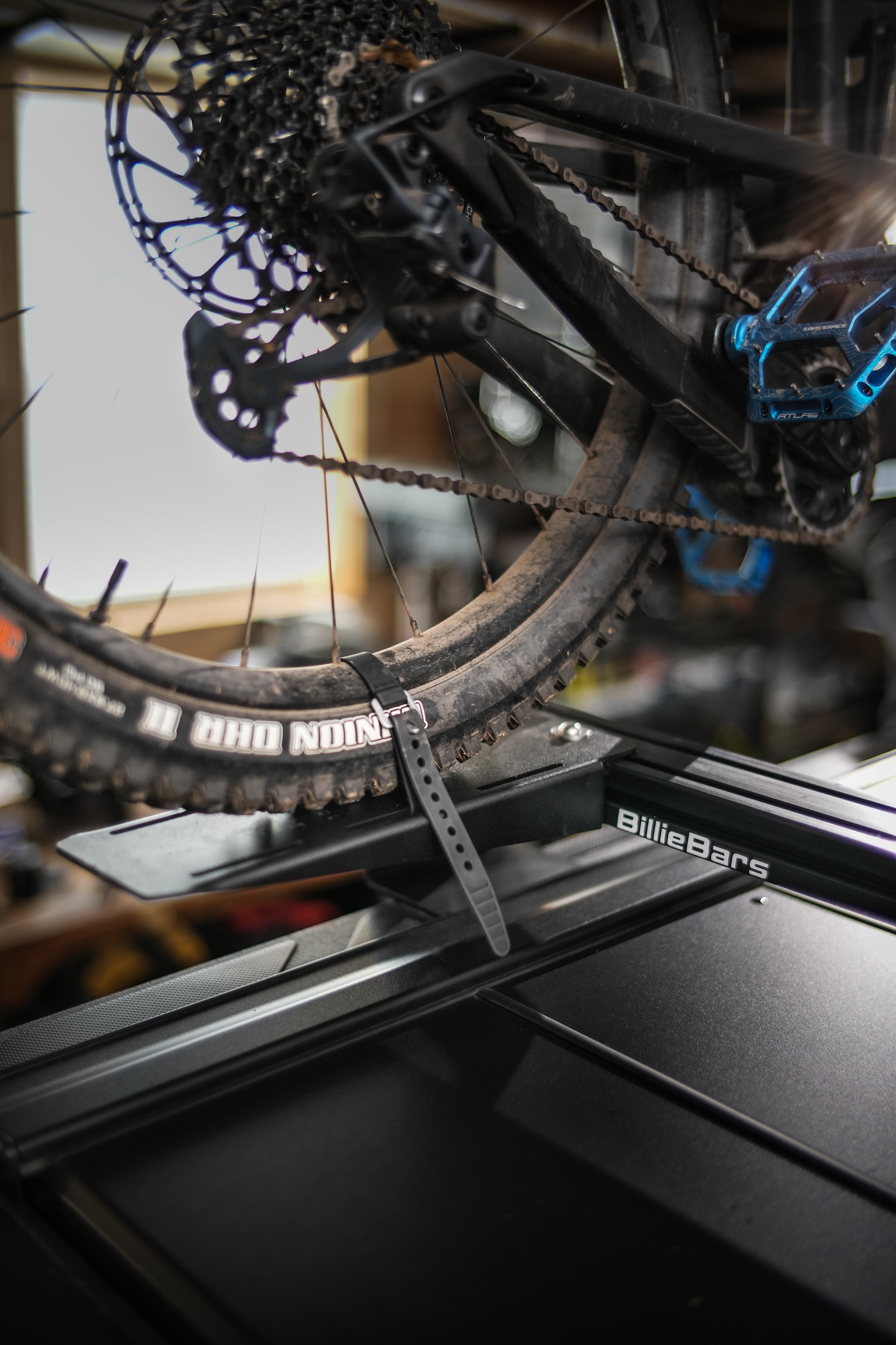 - Securely straps the rear tire down